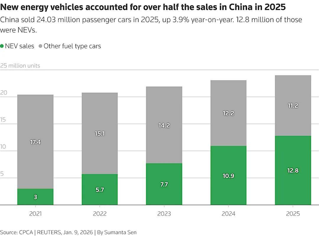 在更大的商场布景下,2025年我国车市已确认进入“新能源主场”。中汽协计算多个方面数据显现,纯电与插混车型在全年销量层面初次超越燃油车,新能源增速虽较上一年放缓,但浸透率仍维持在高位。